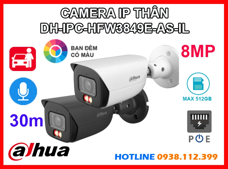 Camera DH-IPC-HFW3849E-AS-IL thuộc dòng WizSense của Dahua độ phân giải 8MP cho hình ảnh chi tiết vượt trội cả ngày lẫn đêm. Nhờ đèn kép thông minh ghi hình có màu ban đêm kết hợp micro tích hợp, hồng ngoại 30m và công nghệ AI nhận diện chính xác người và xe, giúp tăng cường bảo mật hiệu quả.